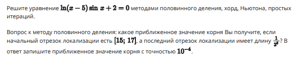 Решите уравнение методами половинного деления, хорд, Ньютона, простых итераций. Вопрос к методу половинного деления: какое приближенное значение корня Вы получите, если начальный отрезок локализации есть , а последний отрезок локализации имеет длину ? В ответ запишите приближенное значение корня с точностью