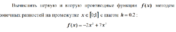 Вычислить первую и вторую производные функции f(x) методом конечных разностей на промежутке с шагом