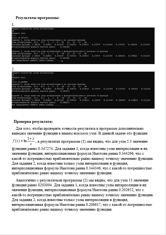 В данном лабораторном занятии рассматриваются два случая, в которых нужно найти значение функции. В первом случае даны интерполяционные узлы и их значения функции. Во втором случае даны интерполяционные узлы, а их значения вычисляются по функции.