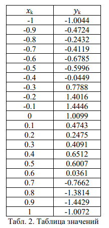 стабилизируется или начинает возрастать Задание 5.5.2: Известно, что y = c1*sin(aπ𝑥)+c2*cos(bπ𝑥), где коэффициенты c1 и c2 подлежат определению. Используя метод наименьших квадратов, определить c1 и c2. (Значения 𝑥k = -1 + 0.1k, k = 0, 1, …, 20; a=3, b=1).