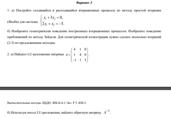 Вариант 3 1. а) Постройте сходящийся и расходящийся итерационные процессы по методу простой итерации (Якоби) для системы 1 2 1 2 3 0, 2 5. x x x x б) Изобразите геометрически поведение построенных итерационных процессов. Изобразите поведение приближений по методу Зейделя. Для геометрической иллюстрации нужно сделать несколько итераций (2-3) по предложенным методам. 2. а) Найдите LU-разложение матрицы 4 1 0 1 4 0 . 1 1 5 A Вычислительные методы. ИДДО. ВМ-Б-4-1-Экз. Р 3. КМ-3. б) Используя метод LU-разложения, найдите обратную матрицу 1 A .