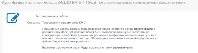 Письменные работы должны быть подсоединены в Прометее в виде одного файла с расширением docx, pdf. Задание может быть выполнено вручную с расчетами на калькуляторе, в любой программе для расчетов с графиками, отражающими суть того или иного вычислительного метода. Образец для выполнения заданий представлен в файле «Задачи для самопроверки».
