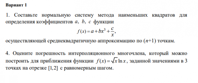 Вариант 1 1. Составьте нормальную систему метода наименьших квадратов для определения коэффициентов a, b, c функции 3 f x( ) , c a bx x    осуществляющей среднеквадратичную аппроксимацию по (n+1) точкам. 4. Оцените погрешность интерполяционного многочлена, который можно построить для приближения функции f x x x ( ) ln  , заданной значениями в 3 точках на отрезке [1, 2] с равномерным шагом..