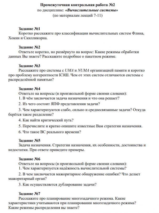 Промежуточная контрольная работа №2 по дисциплине: «Вычислительные системы» (по материалам лекций 7-11)