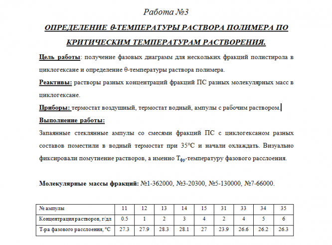 Для студентов МГУ им. Ломоносова по предмету Высокомолекулярные соединения (ВМС)Работа №3 - Определение температуры раствора полимера по критическим температурам растворенияРабота №3 - Определение температуры раствора полимера по критическим температурам растворения