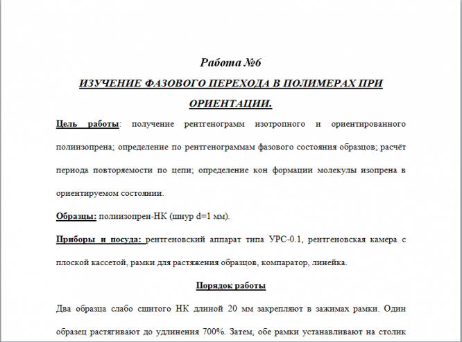 Для студентов МГУ им. Ломоносова по предмету Высокомолекулярные соединения (ВМС)Работа №6 - Изучение фазового перехода в полимерах при ориентацииРабота №6 - Изучение фазового перехода в полимерах при ориентации
