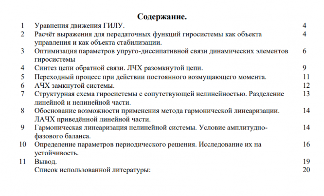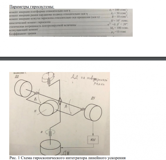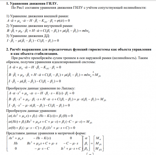 Содержание: Для гиросистемы с заданными кинематической схемой и параметрами механической части: 1. Записать уравнения движения с сопутствующей нелинейностью. 2. Для идеализированной линейной системы преобразовать исходные уравнения к векторно-матричной форме и записать выражения для передаточных функций гиросистемы: а) как объекта управления; б) как объекта стабилизации. 3. Осуществить оптимизацию параметров упруго-диссипативной связи динамических элементов гиросистемы по критерию minmax|W(j)|. 4. Осуществить синтез цепи обратной связи из условия заданной статической точности и необходимых запасов устойчивости. Построить ЛЧХ разомкнутой цепи. 5. Построить переходный процесс по интересующим координатам при действии постоянного возмущающего момента. 6. Построить АЧХ замкнутой гиросистемы. 7. Построить структурную схему гиросистемы с сопутствующей нелинейностью и преобразовать её к одноконтурной, выделив нелинейный элемент и приведённую линейную часть. Записать выражение для передаточной функции приведённой линейной части. 8. Обосновать возможность применения метода гармонической линеаризации. Построить ЛАЧХ приведённой линейной части. 9. Осуществить гармоническую линеаризацию нелинейной системы. Записать условие амплитудно-фазового баланса. 10. Определить параметры периодического решения. Исследовать их устойчивость. 11. Сделать выводы о в