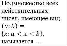 Подмножество всех действительных чисел, имеющее вид (a; b)= {x: a < x < b}, называется …