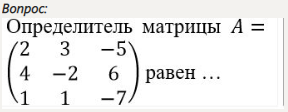 Определитель матрицы А = (2 3 -5) (4 -2 6) (1 1 -7) равен...