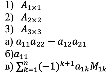 Установите соответствие между размерностью матрицы и формулой для вычисления ее определителя.