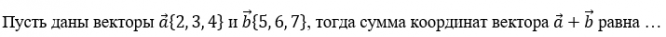 59. Пусть даны векторы a{2, 3, 4} и b{5, 6, 7}, тогда сумма координат вектора a + b равна …