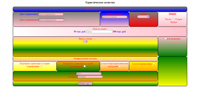 Главная » Учебные материалы » WEB-технологии » Домашние задания » ИДДО НИУ «МЭИ» » Несколько классов/семестров » Номер КМ-3 » КМ-3. Основы J⁣a⁣v⁣a⁣S⁣c⁣r⁣i⁣p⁣t - обработка событий, проверка ввода данных в форму - туристическое агенство