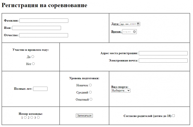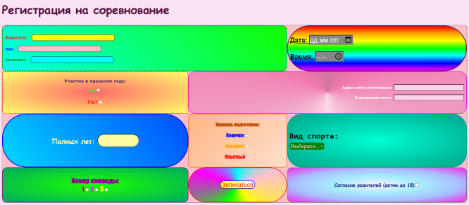 8. Допустимо использование дополнительных (не указанных выше) конструкций CSS для \'улучшения\' внешнего вида html-страницы. 9. После выполнения задания, архивируются два файла .html и .css (в формате zip или arj) и загружаются в Прометей. ПРИМЕЧАНИЕ: 1.Не загружайте в Прометей архивы в формате .7z По каким-то причинам, при скачивании таких файлов, в Прометее возникает ошибка. Далее, для наглядности, приведен пример (делать его не надо, у вас другая форма) внешнего вида html-формы. Что-то подобное должно получиться и у вас..