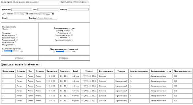 Задание: на базе формы, использованной в работе № 1 1-ой части курса Web-технологии, pазработать web-приложение для отправки данных на сервер, записи их в текстовый файл (например, databases.txt) и вывод отправленных данных на экран в табличном виде из файла databases.txt: