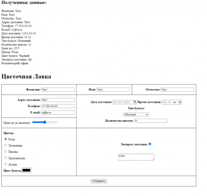 4. Все переданные на сервер данные должны точным образом соответствовать данным, введенным в форму. Например, если в форме позиция ПОЛ: выбрана как "мужской", то после отправки на сервер должно быть выведено "мужской", а не "m" или "male"; если отмечена (не отмечена) позиция ЗАЧЕТ, то на сервере должно быть выведено "зачет" ("не зачет"), а не on и т.п.