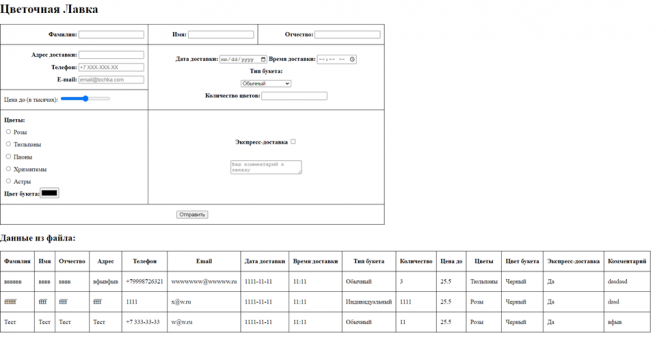 2. Таблица с записями из текстового файла должна появляться после создания файла и записи туда информации из формы. Она может располагаться либо перед формой, либо после нее.