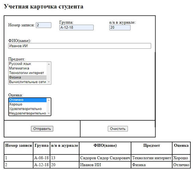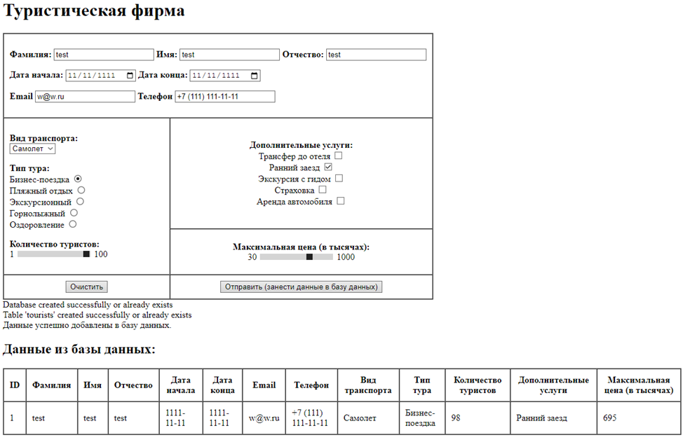 Задание: на базе формы, использованной в работах № 1 и 2, pазработать web-приложение для отправки данных на сервер, записи их в базу данных (используется MySQL/MariaDB) и вывод данных на экран в табличном виде.