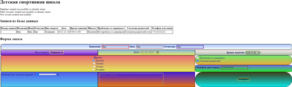 Задание: на базе формы, использованной в работах № 1 и 2, pазработать web-приложение для отправки данных на сервер, записи их в базу данных (используется MySQL/MariaDB) и вывод данных на экран в табличном виде.