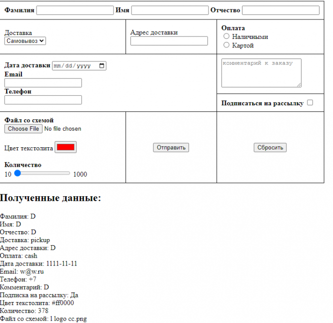 4. Все переданные на сервер данные должны точным образом соответствовать данным, введенным в форму. Например, если в форме позиция ПОЛ: выбрана как "мужской", то после отправки на сервер должно быть выведено "мужской", а не "m" или "male"; если отмечена (не отмечена) позиция ЗАЧЕТ, то на сервере должно быть выведено "зачет" ("не зачет"), а не on и т.п.