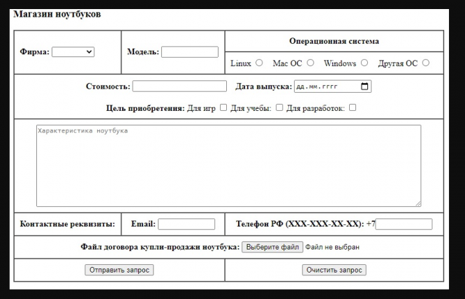 3. Поля ввода данных типа даты, времени, целых чисел, телефона, электронной почты должны быть организованы с помощью, соответствующих этим типам данным, тегов форм HTML 5, а не с помощью type='text'. Для поля ввода телефона необходимо в форму добавить образец ввода цифр и символов. Например, +7 ХХХ-ХХХ-ХХ, ХХХХХХХХХХХ, ХХ-ХХХХХХХХ и т.п. Пользователю должно быть понятно, в каком виде вводить информацию. Не корректные и 'пустые' данные не должны передаваться на сервер.