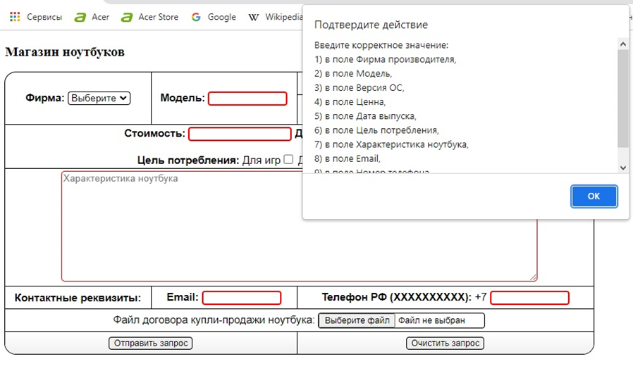 3. С помощью конструкций языка jаvascript (а не HTML 5), проверять ввод данных и блокировать передачу их на сервер в случае обнаружения некорректных данных: пустые поля text, некорректные значения в поле где должно быть число и невыбранные radio и select. Выводить в окно браузера соответствующее сообщение (например, 'Введите корректное значение в поле Цена' или 'Введите данные в поле ФИО'). Выводить сообщение можно только одно, о первой обнаруженной некорректности с указанием конкретного поля или можно объединить все поля с некорректными данными в одном сообщении. Если все данные введены корректно, должно появиться окно данных, переданных на сервер (как в предыдущих работах).