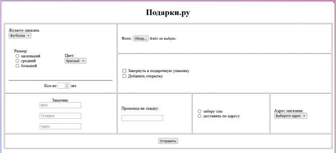 Главная » Учебные материалы » WEB-технологии » Домашние задания » ИДДО НИУ «МЭИ» » Несколько классов/семестров » Номер КМ-1 » КМ-1. Основы языка разметки HTML - элементы форматирования html-страницы, таблицы, фреймы, формы. Вариант подарки.ру