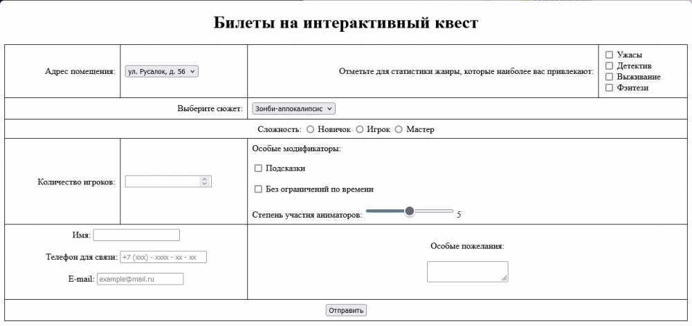 Главная » Учебные материалы » WEB-технологии » Домашние задания » ИДДО НИУ «МЭИ» » Несколько классов/семестров » Номер КМ-1 » КМ-1. Основы языка разметки HTML - элементы форматирования html-страницы, таблицы, фреймы, формы. Вариант билеты на интерактивный квест
