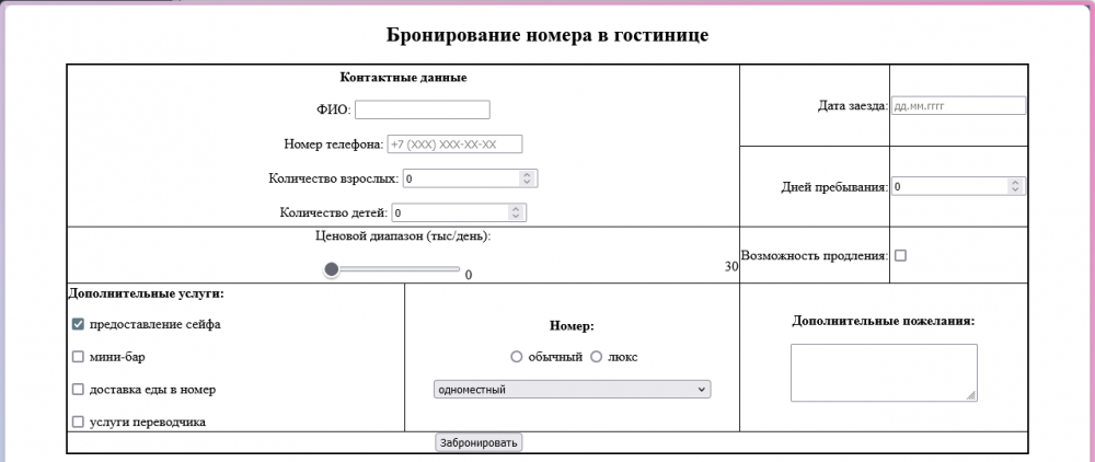 КМ-1. Основы языка разметки HTML - элементы форматирования html-страницы, таблицы, фреймы, формы. Вариант бронирование номера в гостинице