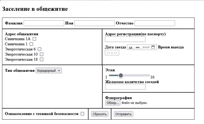 Главная » Учебные материалы » WEB-технологии » Домашние задания » ИДДО НИУ «МЭИ» » Несколько классов/семестров » Номер КМ-1 » КМ-1. Основы языка разметки HTML - элементы форматирования html-страницы, таблицы, фреймы, формы. Вариант заселение в общежитие