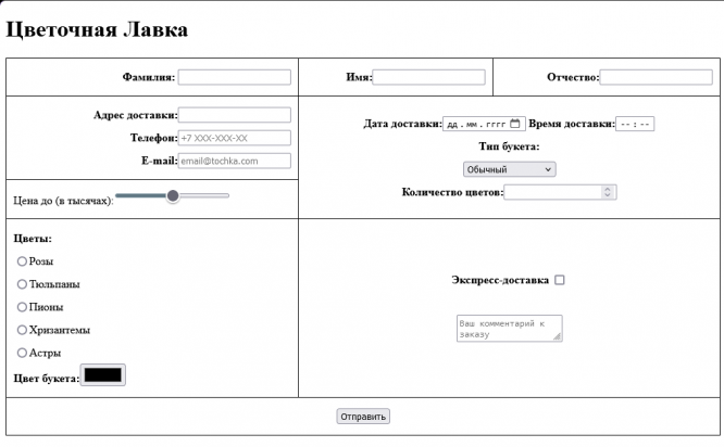 Главная » Учебные материалы » WEB-технологии » Домашние задания » ИДДО НИУ «МЭИ» » Несколько классов/семестров » Номер КМ-1 » КМ-1. Основы языка разметки HTML - элементы форматирования html-страницы, таблицы, фреймы, формы. Вариант цветочная лавка