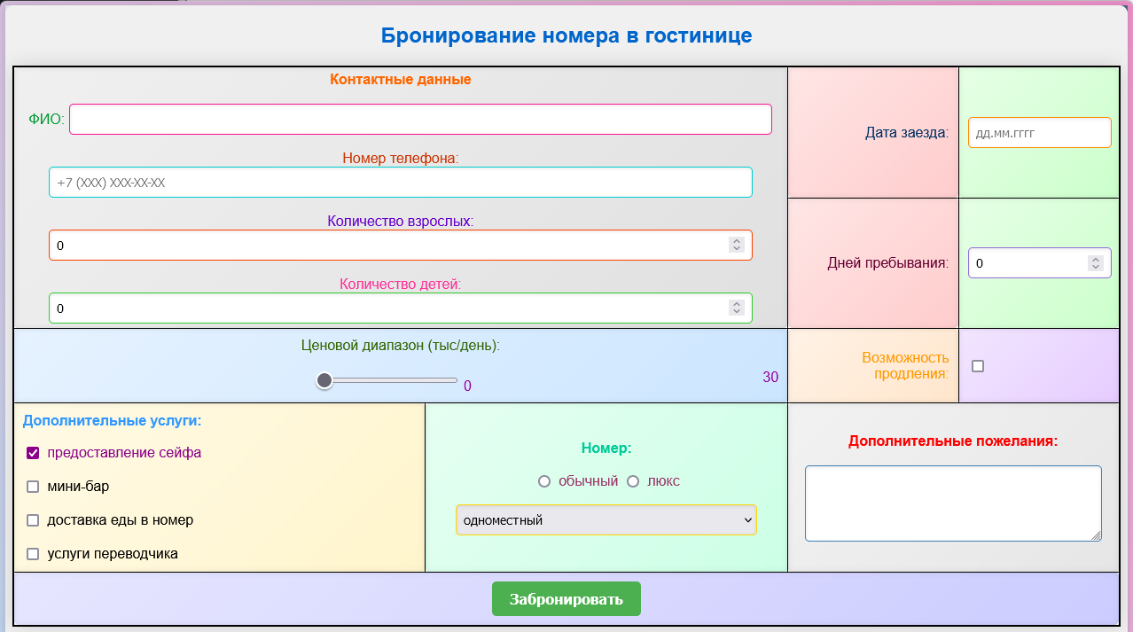 Главная » Учебные материалы » WEB-технологии » Домашние задания » ИДДО НИУ «МЭИ» » Несколько классов/семестров » Номер КМ-2 » КМ-2. Основы каскадных таблиц стилей - CSS. Спецсимволы в HTML. Вариант бронирование номеров в гостинице