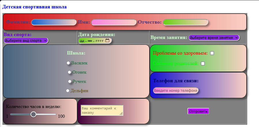 Главная » Учебные материалы » WEB-технологии » Домашние задания » ИДДО НИУ «МЭИ» » Несколько классов/семестров » Номер КМ-2 » КМ-2. Основы каскадных таблиц стилей - CSS. Спецсимволы в HTML. Вариант детская спортивная школа