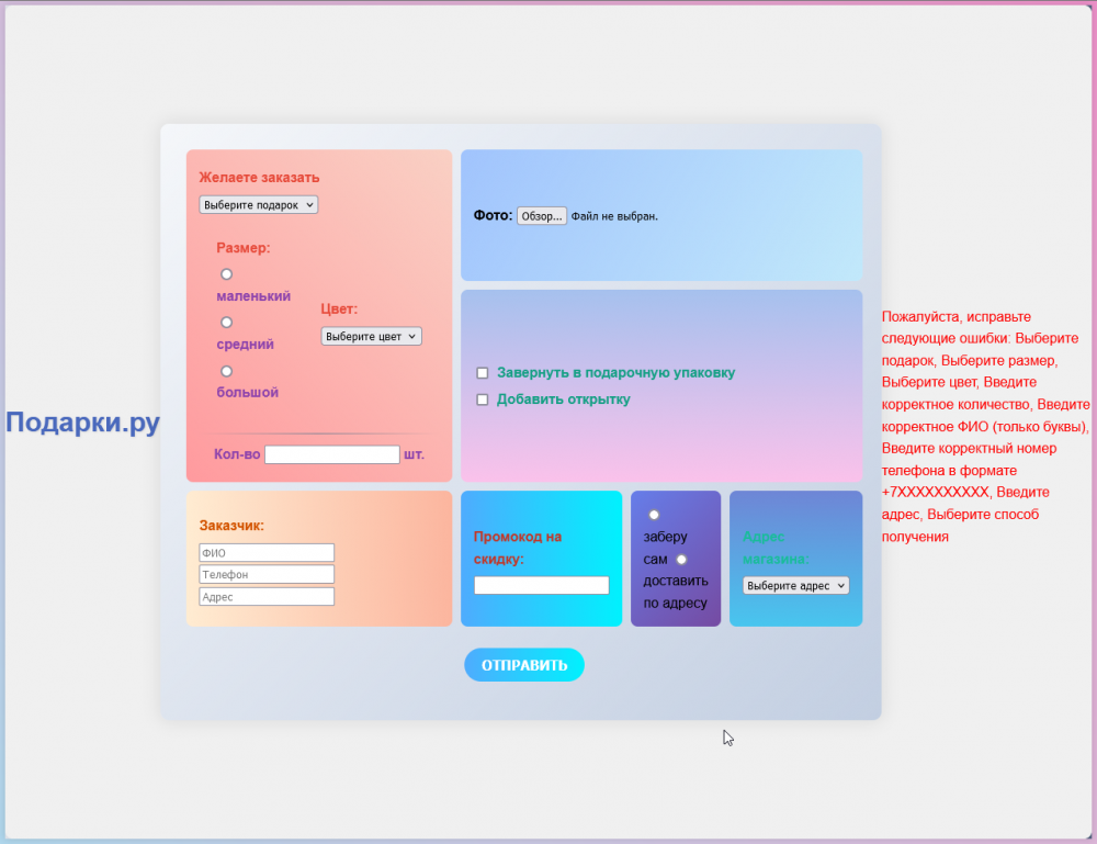 ДЗ КМ-3: КМ-3. Основы JavaScript - обработка событий, проверка ввода данных в форму. Вариант подарки.ру
