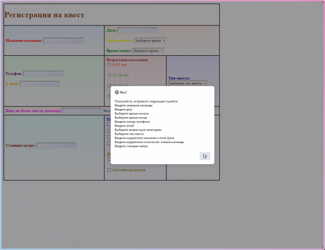 Главная » Учебные материалы » WEB-технологии » Домашние задания » ИДДО НИУ «МЭИ» » Несколько классов/семестров » Номер КМ-3 » КМ-3. Основы J⁣a⁣v⁣a⁣S⁣c⁣r⁣i⁣p⁣t - обработка событий, проверка ввода данных в форму. Вариант регистрация на квест