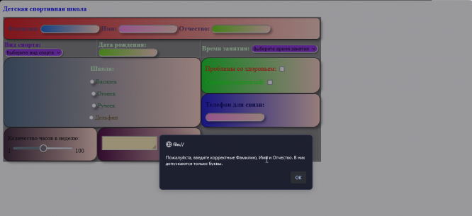 ДЗ КМ-3: КМ-3. Основы J⁣a⁣v⁣a⁣S⁣c⁣r⁣i⁣p⁣t - обработка событий, проверка ввода данных в форму. Вариант детская спортивная школа
