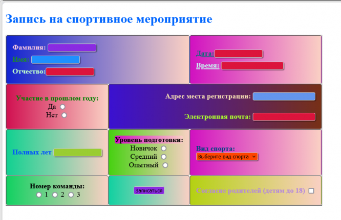 Главная » Учебные материалы » WEB-технологии » Домашние задания » ИДДО НИУ «МЭИ» » Несколько классов/семестров » Номер КМ-3 » КМ-3. Основы J⁣a⁣v⁣a⁣S⁣c⁣r⁣i⁣p⁣t - обработка событий, проверка ввода данных в форму. Вариант запись на спортивное мероприятие
