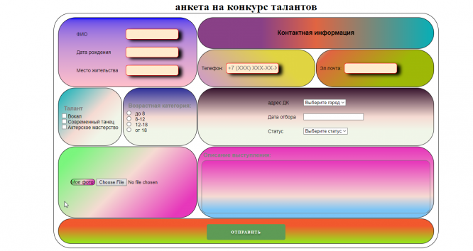 Главная » Учебные материалы » WEB-технологии » Домашние задания » ИДДО НИУ «МЭИ» » Несколько классов/семестров » Номер КМ-6 » КМ-6. Передача параметров между сценариями (скриптами) PHP. Отправка данных на сервер с помощью форм. Вариант анкета на конкурс талантов