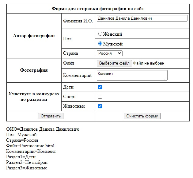 4. Все переданные на сервер данные должны точным образом соответствовать данным, введенным в форму. Например, если в форме позиция ПОЛ: выбрана как "мужской", то после отправки на сервер должно быть выведено "мужской", а не "m" или "male"; если отмечена (не отмечена) позиция ЗАЧЕТ, то на сервере должно быть выведено "зачет" ("не зачет"), а не on и т.п.