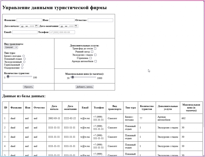 Задание: на базе формы, использованной в работах № 1 и 2, pазработать web-приложение для отправки данных на сервер, записи их в базу данных (используется MySQL/MariaDB) и вывод данных на экран в табличном виде.