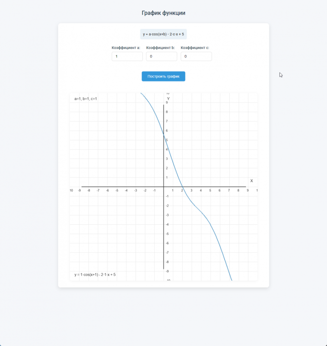ЗАДАНИЕ: с помощью конструкций языка веб-программирования PHP нарисовать график функции y = a * cos(x + b) - 2 * c * x + 5. Для выполнения данной работы вам необходимо подключить модуль графической библиотеки PHP - gd2.