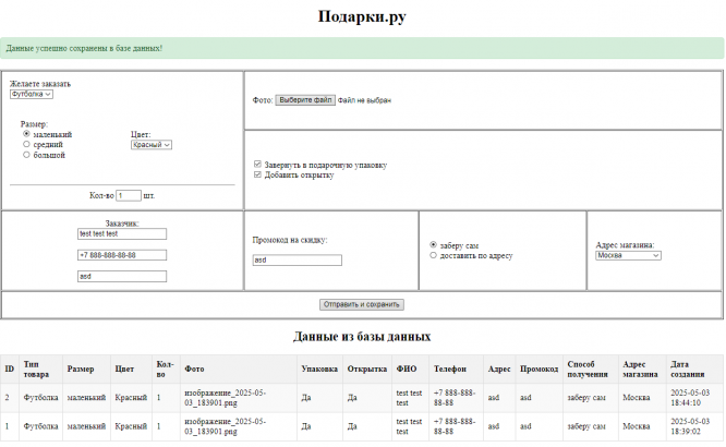 Задание: на базе формы, использованной в работах № 1 и 2, pазработать web-приложение для отправки данных на сервер, записи их в базу данных (используется MySQL/MariaDB) и вывод данных на экран в табличном виде.