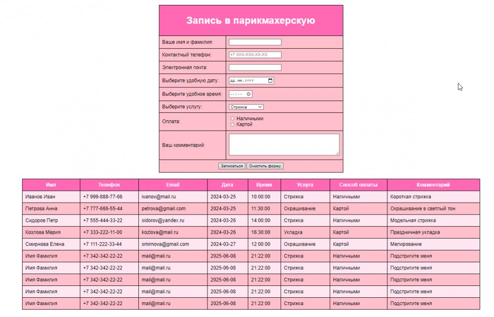 Задание: на базе формы, использованной в работах № 1 и 2, pазработать web-приложение для отправки данных на сервер, записи их в базу данных (используется MySQL/MariaDB) и вывод данных на экран в табличном виде.