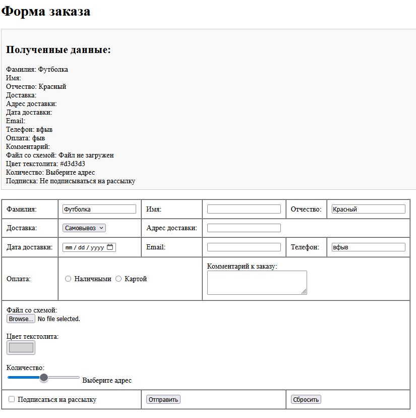 4. Все переданные на сервер данные должны точным образом соответствовать данным, введенным в форму. Например, если в форме позиция ПОЛ: выбрана как "мужской", то после отправки на сервер должно быть выведено "мужской", а не "m" или "male"; если отмечена (не отмечена) позиция ЗАЧЕТ, то на сервере должно быть выведено "зачет" ("не зачет"), а не on и т.п.