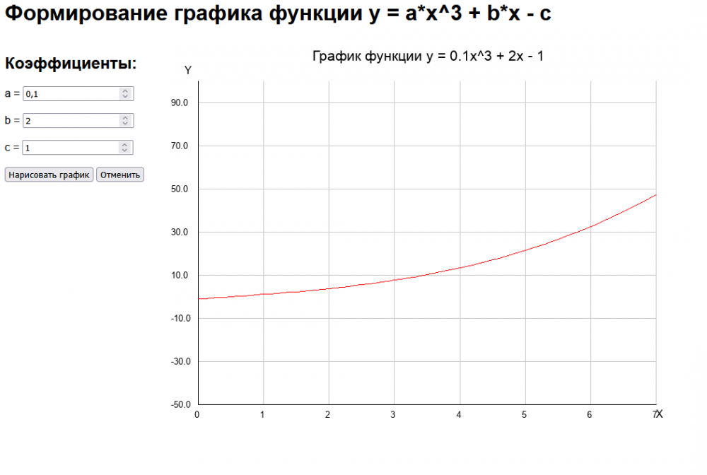 НАЗВАНИЕ ПИСЬМЕННОЙ РАБОТЫ: Создание и обработка изображений средствами PHP. ЗАДАНИЕ: с помощью конструкций языка веб-программирования PHP разработать web-приложение для рисования графика функции y = a*tg(x+b)+c. Внешний вид приложения представлен на рисунке ниже (не забывайте, что это пример и у вас другая функция). ОПИСАНИЕ ЗАДАНИЯ: - Количество файлов проекта не ограничено. - Задание должно быть реализовано с помощью оконной системы (2 окна на одном экране, можно использовать фреймы): в одном окне вызывающая форма с параметрами рисунка функции. Второе окно - непосредственно изображение рисунка функции. Все изменения данных в форме должны отображаться на рисунке функции. - Все надписи на графике функции и координатной сетке должны быть выполнены с использованием ttf-фонтов. Их можно найти в Интернете или на вашем компьютере в соответствующих каталогах. Фонты должны быть размещены в рабочем/рабочих каталоге вашего приложения. В некоторых случаях, в зависимости от версии библиотеки GD2 и настроек окружающей среды вашей ОС, при использовании ttf-фонтов, необходимо указывать их полные пути в операционной системе (в некоторых - достаточно относительных путей). В связи с этим, скрипты должны быть написаны таким образом, чтобы устойчиво функционировать на любой машине, где установлено соответствующее программное обеспечение (web-сервер, PHP, GD2 и т.п.).