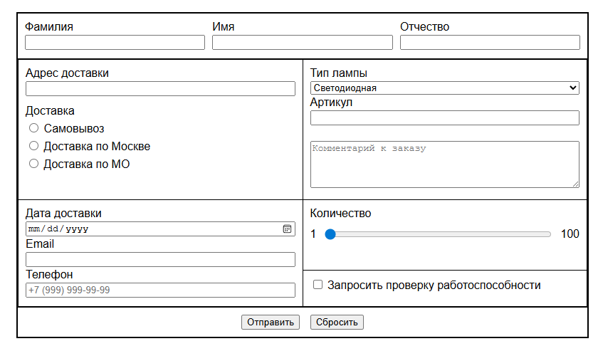3. Поля ввода данных типа даты, времени, целых чисел, телефона, электронной почты должны быть организованы с помощью, соответствующих этим типам данным, тегов форм HTML 5, а не с помощью type='text'. Для поля ввода телефона необходимо в форму добавить образец ввода цифр и символов. Например, +7 ХХХ-ХХХ-ХХ, ХХХХХХХХХХХ, ХХ-ХХХХХХХХ и т.п. Пользователю должно быть понятно, в каком виде вводить информацию. Не корректные и 'пустые' данные не должны передаваться на сервер.