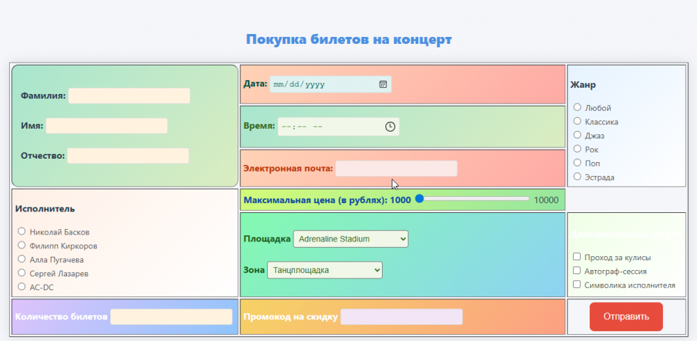 ДЗ КМ-2: КМ-2. Основы каскадных таблиц стилей - CSS. Спецсимволы в HTML. Вариант покупка билетов на концерт