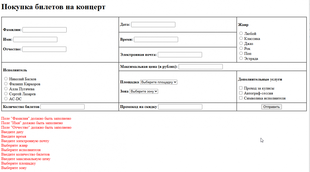 ДЗ КМ-3: КМ-3. Основы JavaScript - обработка событий, проверка ввода данных в форму. Вариант Покупка билетов на концерт вариант Покупка билетов на к