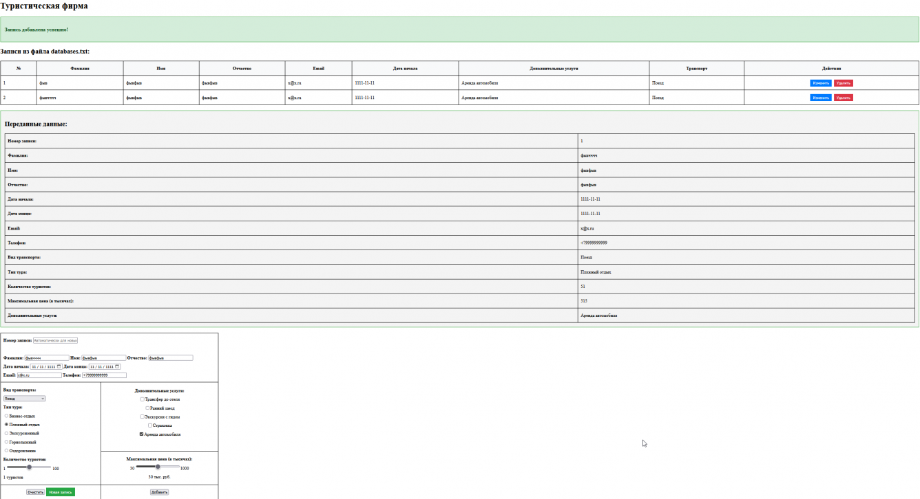 2. Таблица с записями из текстового файла должна появляться после создания файла и записи туда информации из формы. Она может располагаться либо перед формой, либо после нее.