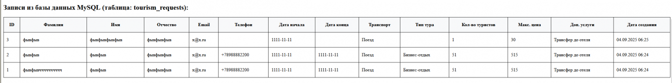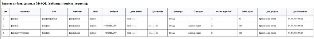 Задание: на базе формы, использованной в работах № 1 и 2, pазработать web-приложение для отправки данных на сервер, записи их в базу данных (используется MySQL/MariaDB) и вывод данных на экран в табличном виде.