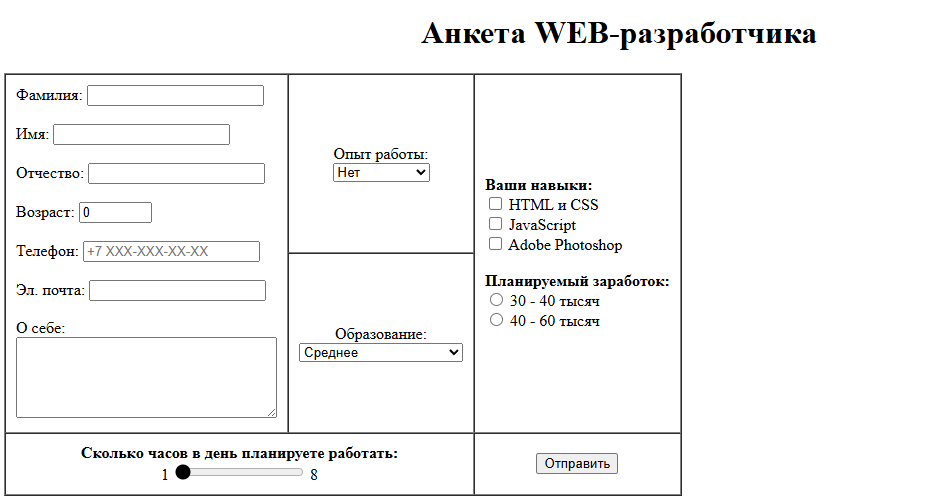 КМ-1. Основы языка разметки HTML - элементы форматирования html-страницы, таблицы, фреймы, формы. Вариант 12 Анкета WEB-разработчика